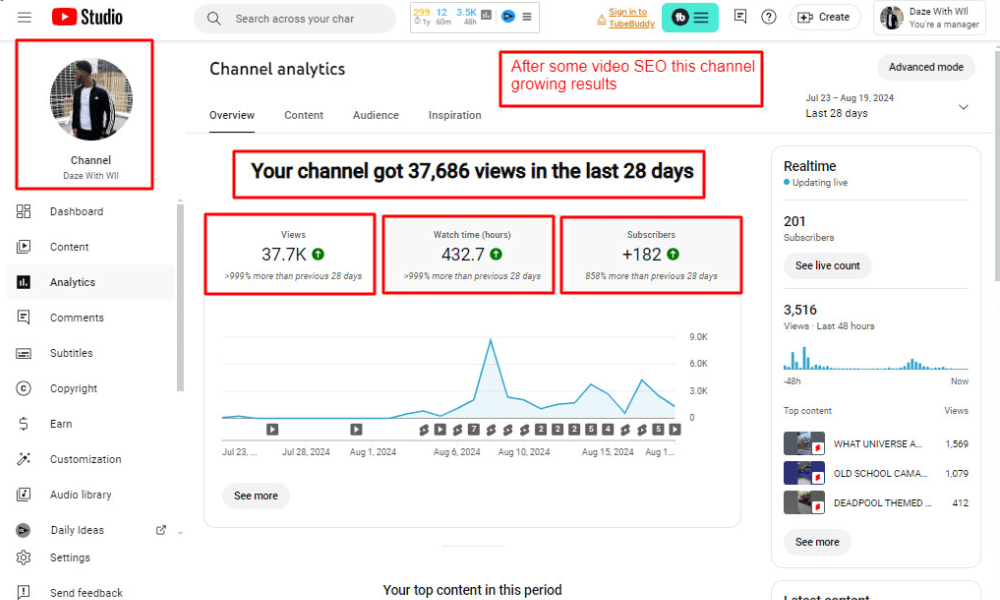 A content creator specializing in productivity and personal development noticed their videos were not performing well despite good content quality. The goal was to increase views, engagement, and ranking on YouTube's search results and suggested videos.